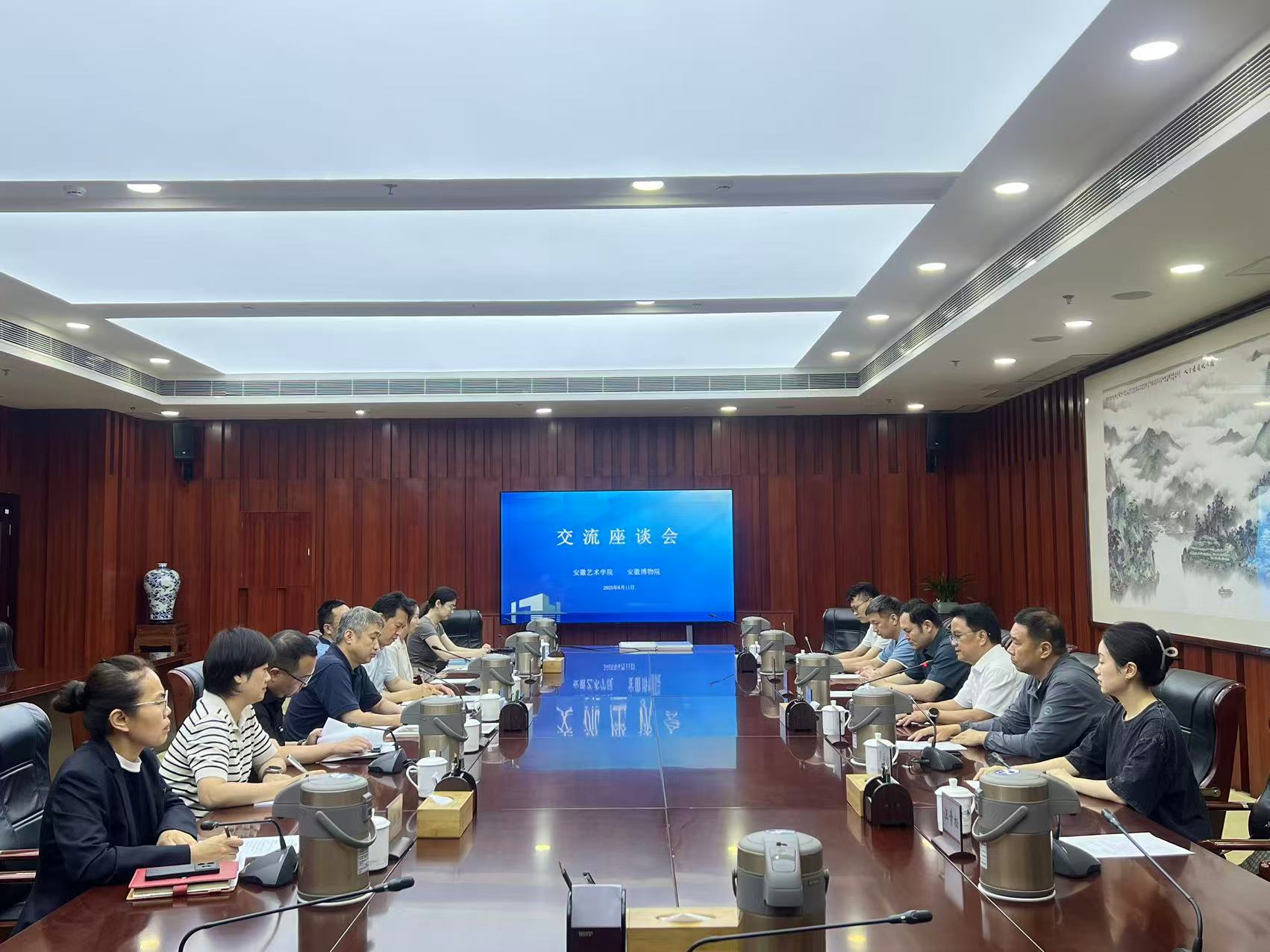 为高质量推进《新安画派临摹范本精品选集》第二辑的编撰与出版工作,深化院校与文博机构的合作,6月11日下午,美术学院党总支书记陈明海、新安画派研究院院长刘伟、书法所所长张典友及中国画教研室教师代表一行赴安徽博物院进行专题调研。安徽博物院副院长季永、刘华伟及相关业务部门负责人出席。会议由刘华伟主持。