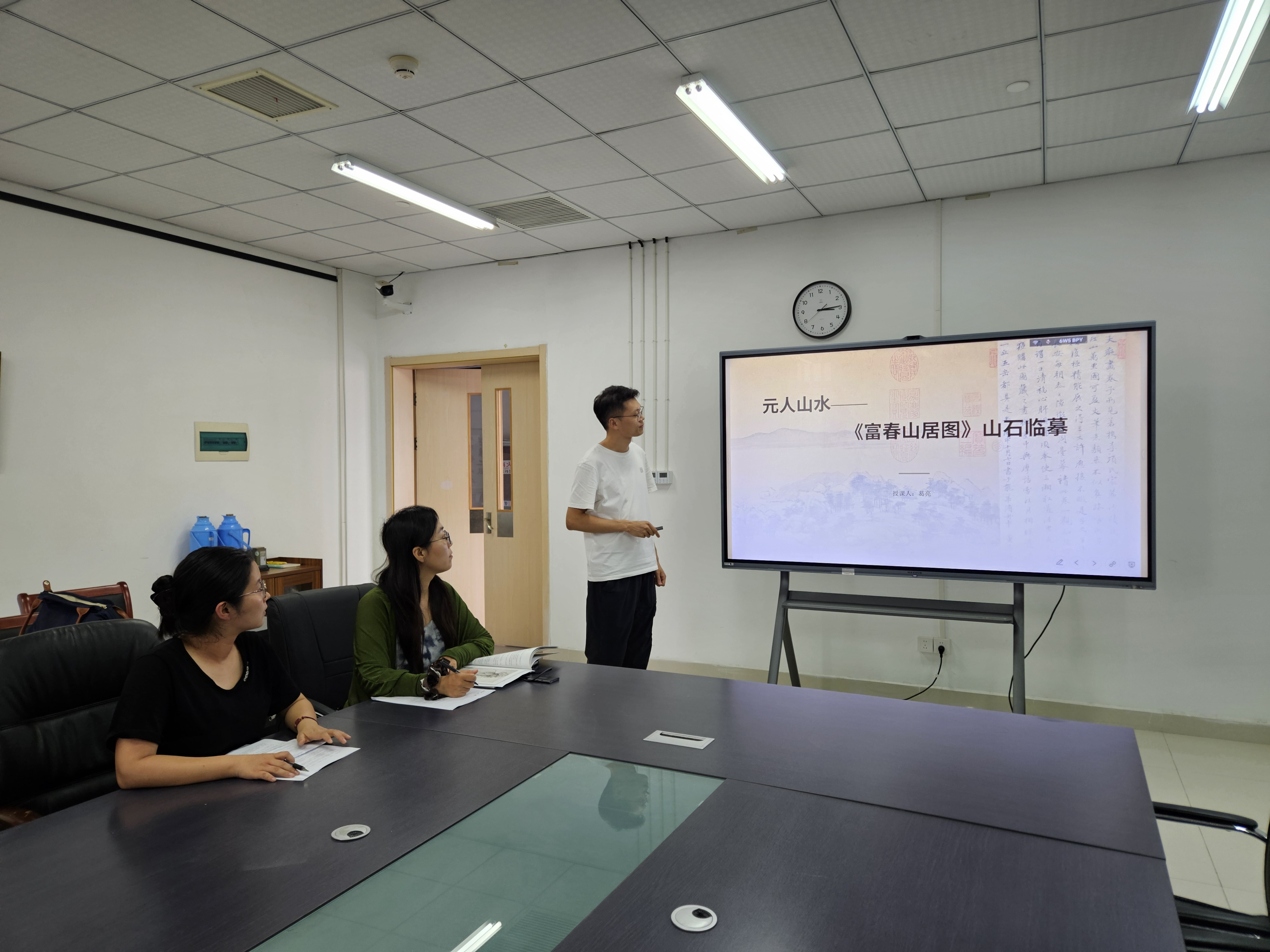 此次磨课涵盖三门特色课程,均以经典艺术为依托,精准定位教学重点。周娟娟老师的花鸟画创作课程,以吴昌硕绘画艺术为核心解析对象,系统讲授其绘画技法,助力学生突破“临”“创”转换难点,掌握自主创作能力,实现从技法学习到艺术表达的跨越;葛亮老师的元人山水课程,以《富春山居图》为载体,先做整体艺术分析,再聚焦山石临摹,通过技法讲解与实操指导,引导学生理解黄公望山石笔墨精神,独立完成临摹作业;王力平老师的工笔人物课程,以白描写生笔法为重点,通过剖析李公麟《五马图》中牧马人线描形象、以及分析三组人物写生线描案例,帮助学生掌握工笔白描精髓,提升线描造型与艺术表现能力。