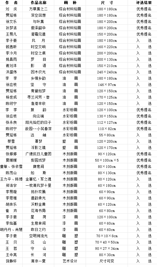 近日,第九届安徽美术大展评选结果揭晓,suncitygroup太阳新城官网美术学院绘画教研室师生取得了丰硕成果。经过初评和复评,师生们在多个画种中均有良好表现,共有41幅作品成功入选,其中13幅作品脱颖而出,获得优秀提名。充分展示了美术学院深厚的教学实力与师生们蓬勃的艺术创造力。