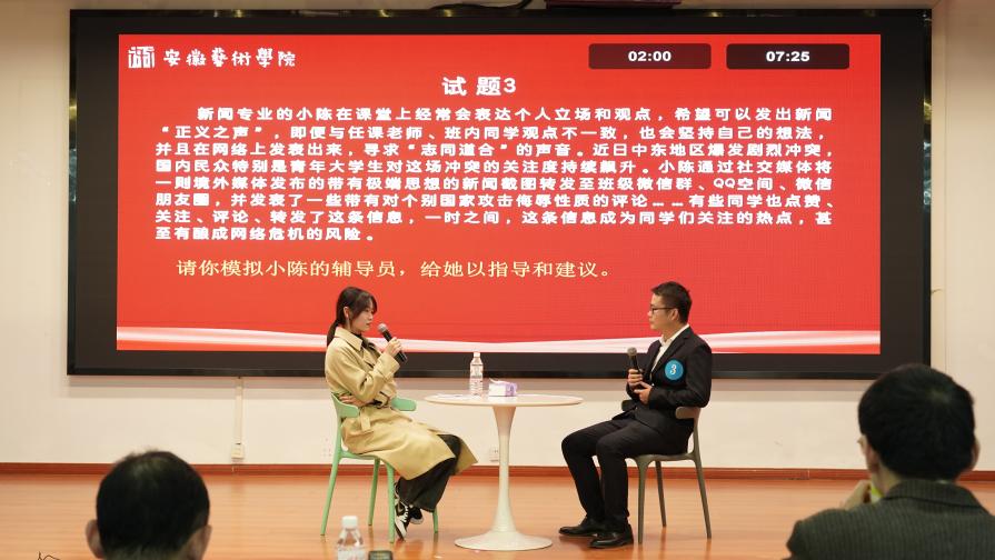大赛以“以赛促学、以赛促建、提升素养、赋能成长”为目标,设置案例研讨、谈心谈话两个环节。何刘涛老师作为我院辅导员代表参赛,凭借扎实的理论功底、精湛的职业技能以及真挚的育人情怀,展现出新时代高校辅导员专业素养与责任担当。